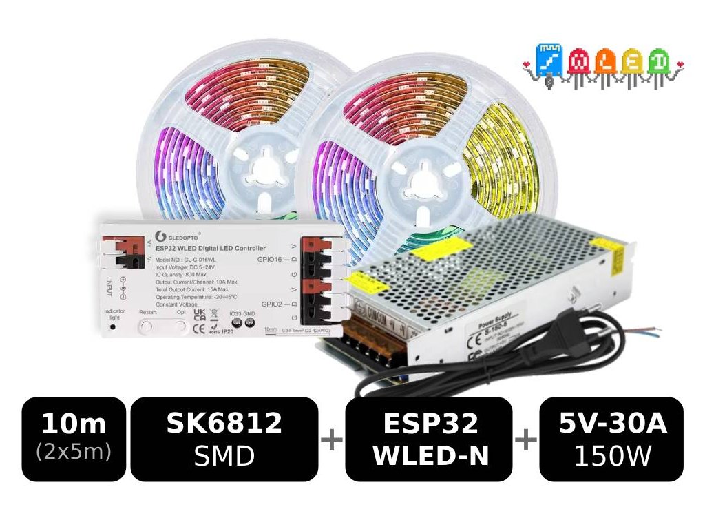 Programovateľný set: 10m, SK6812 SMD | IP20, ESP32 WLED-N Controller, 5V-30A (150W)