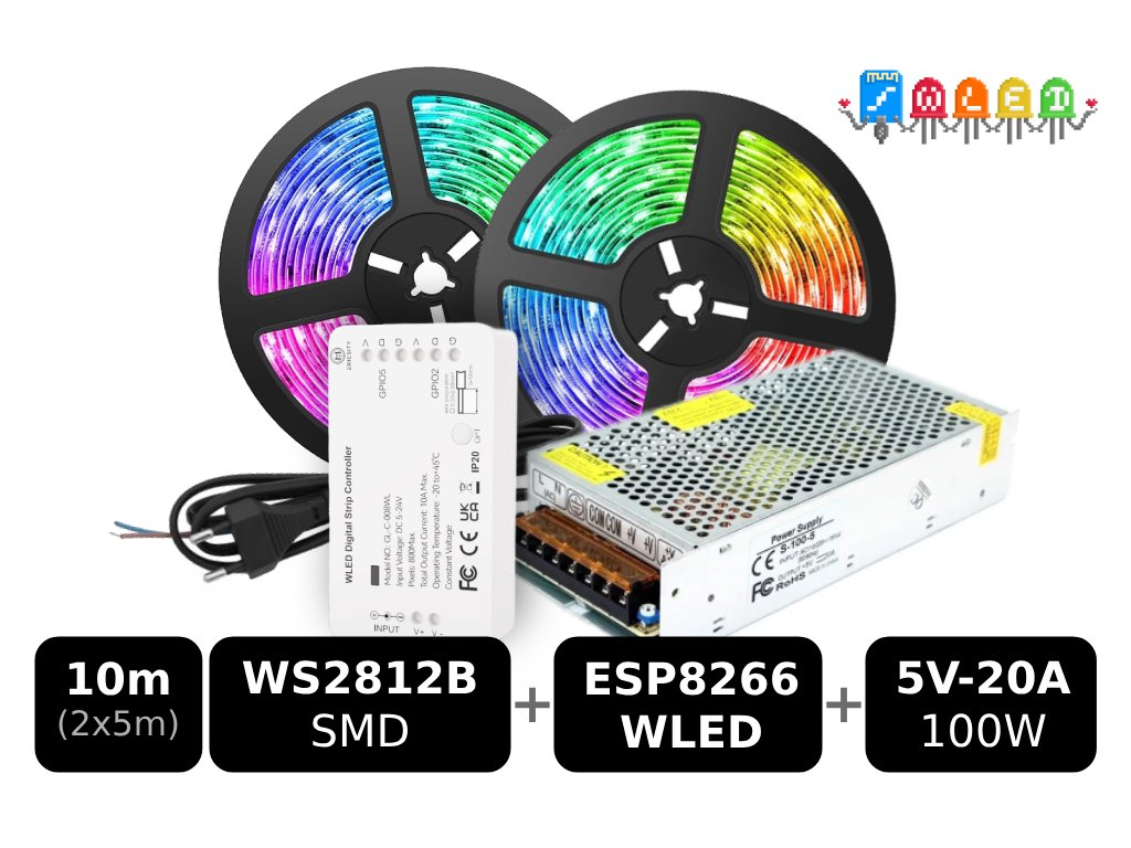 Programovateľný set: 10m, WS2812B SMD | IP65, ESP8266 WLED Controller, 5V-20A (100W)