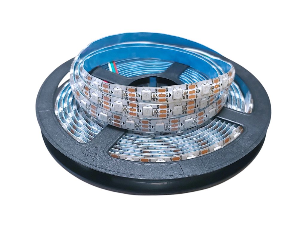 Digitálny RGB-IC LED pásik WS2812B | SMD s hodnotou krytia IP65 a dĺžkou 10 metrov (2x5m). Na tomto pásiku s hustotou 60led/m je možné ovládať každú jednu LED osobitne (300 pixelov). LED pásik je napájaný 5V jednosmerným napätím a na svojich oboch koncoch má umiestnené JST SM konektory pre jednoduché spájanie.