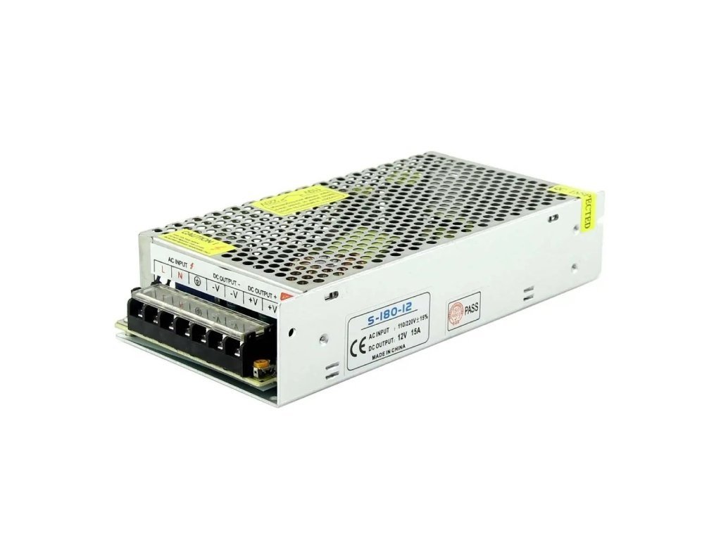 Univerzálny montážny napájací zdroj s konštantným výstupným jednosmerným napätím 12V ktorý vie poskytnúť odber prúdu až 15A (180W).