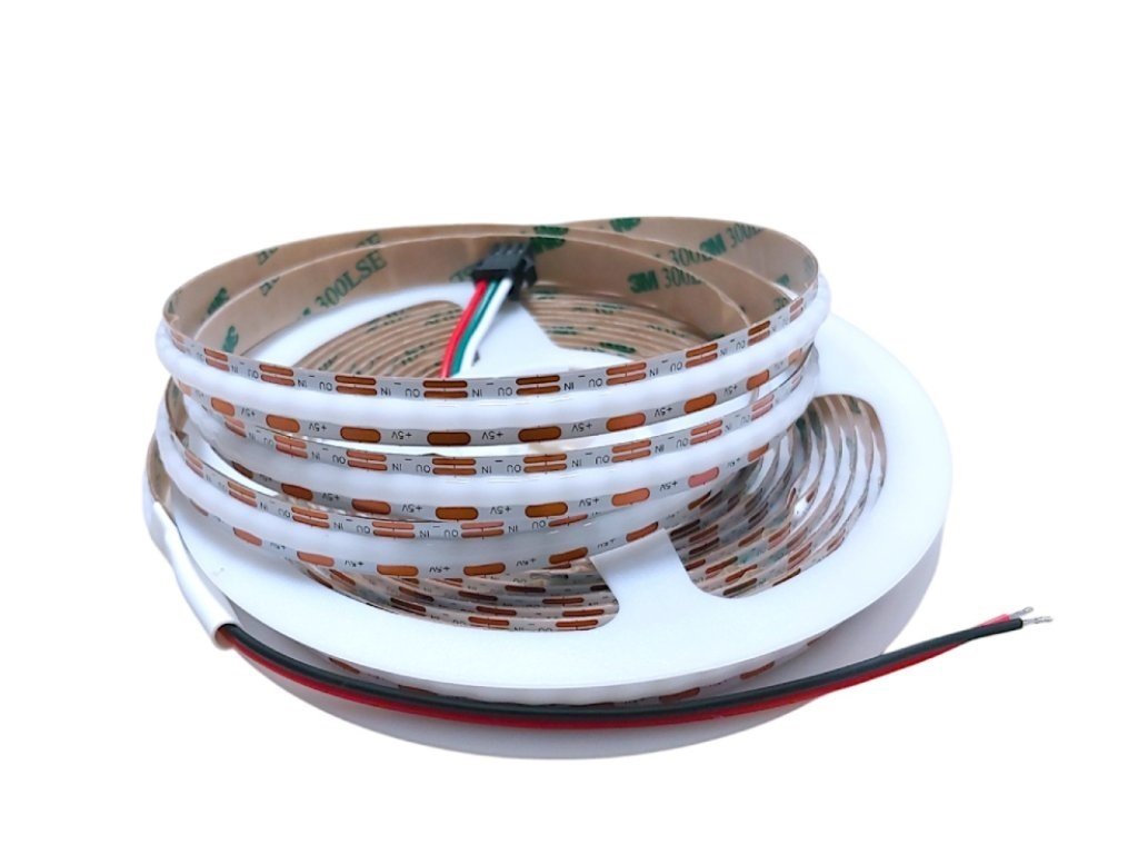 Digitálny RGB-IC LED pásik WS2812B COB (Chip On Board) je výnimočný hlavne tým, že má LED diódy usporiadane tesne pri sebe, čím vytvárajú plynulé, súvislé svetlo bez medzier. Na rozdiel od tradičných SMD LED pásikov, kde sú jednotlivé LED diódy viditeľné a oddelené od seba. Vďaka tomu sú ideálne pre aplikácie vyžadujúce plynulé a nepretržité osvetlenie.